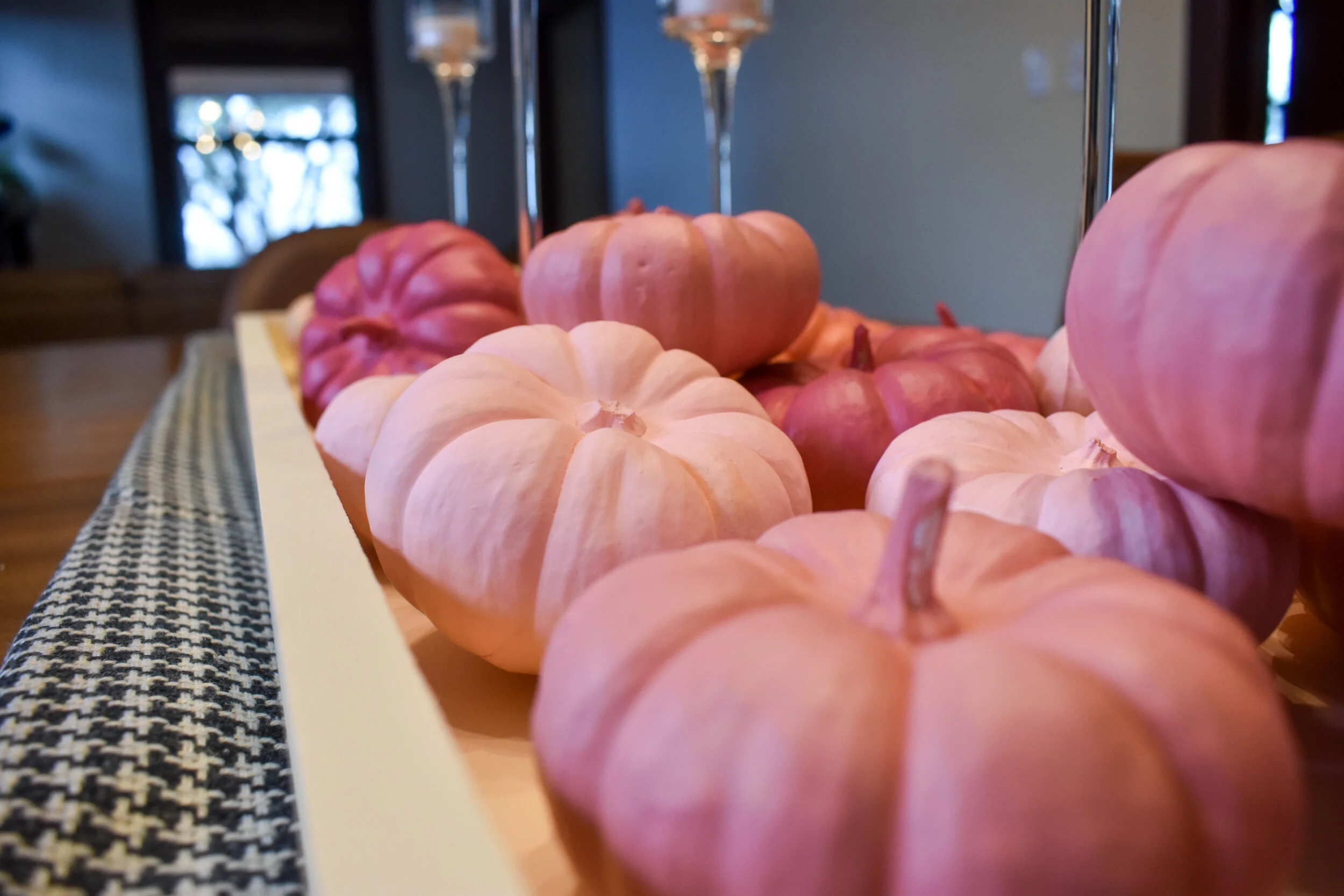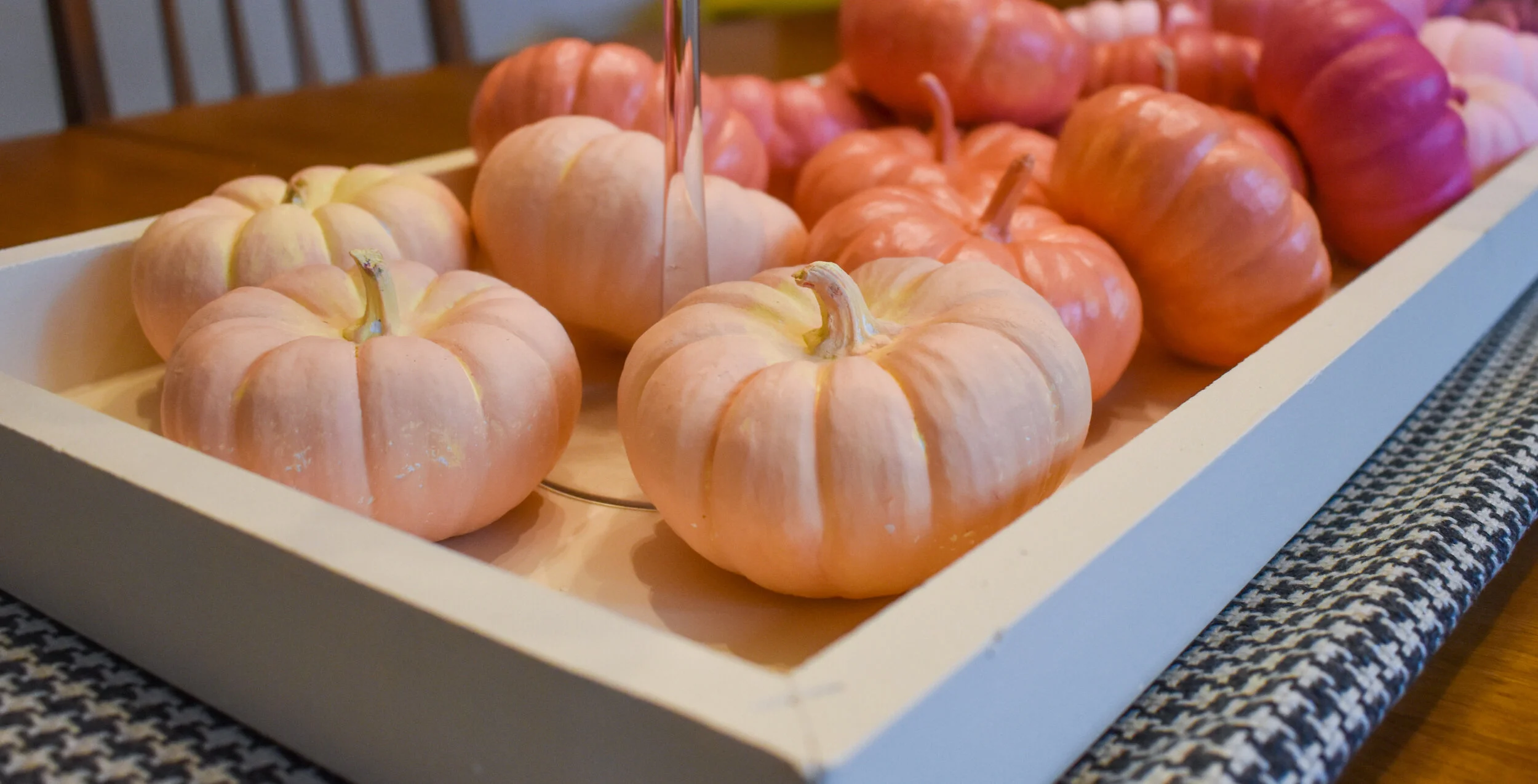 This cold weather has given me some motivation. I set out to start decorating for Fall. I found an amazing centerpiece idea from ohhappyday.com. Their’s is obviously cuter, but I think mine turned out pretty nice. I also didn’t want to put the painted pumpkins directly on the table. There are a couple reasons for this. One, I didn’t want the paint to rub off on our table. Two, I wanted to be able to move the entire piece instead of taking off each individual pumpkin.